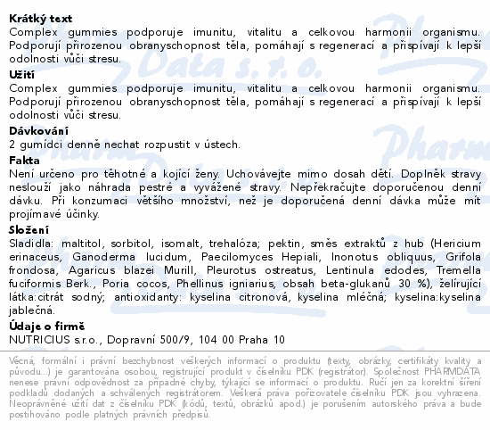 Complex gummies podporuje imunitu, vitalitu a celkovou harmonii organismu. Podporují přirozenou obranyschopnost těla, pomáhají s regenerací a přispívají k lepší odolnosti vůči stresu.