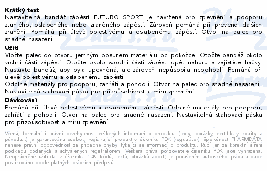 Nastavitelná bandáž zápěstí FUTURO SPORT je navržená pro zpevnění a podporu ztuhlého, oslabeného nebo zraněného zápěstí. Zároveň pomáhá při prevenci dalších zranění. Pomáhá při úlevě bolestivému a oslabenému zápěstí. Otvor na palec pro snadné nasazení.
