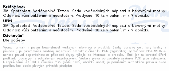 3M Spofaplast Voděodolné Tattoo. Sada voděodolných náplastí s barevnými motivy. Odolnost vůči bakteriím a nečistotám. Prodyšné. 10 ks v balení, mix 9 obrázku.