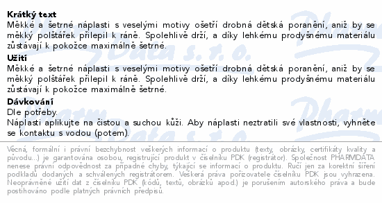 Měkké a šetrné náplasti s veselými motivy ošetří drobná dětská poranění, aniž by se měkký polštářek přilepil k ráně. Spolehlivě drží, a díky lehkému prodyšnému materiálu zůstávají k pokožce maximálně šetrné.