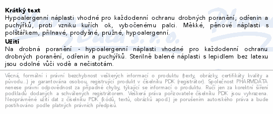 Hypoalergenní náplasti vhodné pro každodenní ochranu drobných poranění, odřenin a puchýřků, proti vzniku kuřích ok, vybočenému palci. Měkké, pěnové náplasti s polštářkem, přilnavé, prodyšné, pružné, hypoalergenní.