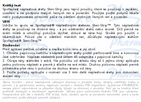 Spofaplast náplasťové stehy Steri-Strip jsou lepící proužky, které se používají k zajištění, uzavření a na podporu malých řezných ran a poranění. Použijte podle pokynů lékaře nebo poskytovatele zdravotní péče na ošetření drobných řezných ran a poranění.