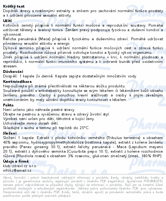 Doplněk stravy s rostlinnými extrakty a zinkem pro zachování normální funkce prostaty a k udržení přirozené sexuální aktivity.