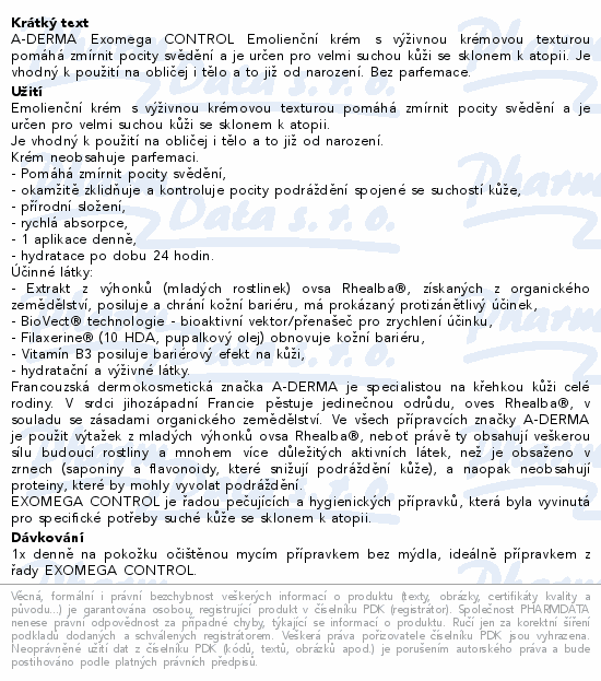 A-DERMA Exomega CONTROL Emolienční krém s výživnou krémovou texturou pomáhá zmírnit pocity svědění a je určen pro velmi suchou kůži se sklonem k atopii. Je vhodný k použití na obličej i tělo a to již od narození. Bez parfemace.
