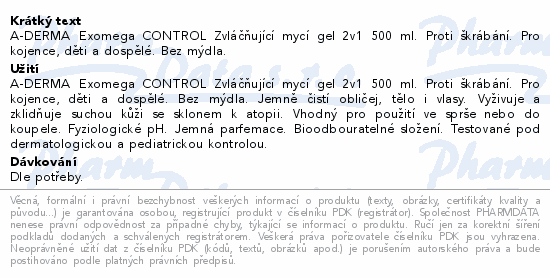 A-DERMA Exomega CONTROL Zvláčňující mycí gel 2v1 500 ml. Proti škrábání. Pro kojence, děti a dospělé. Bez mýdla.