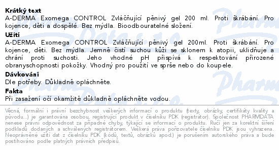 A-DERMA Exomega CONTROL Zvláčňující pěnivý gel 200 ml. Proti škrábání. Pro kojence, děti a dospělé. Bez mýdla. Bioodbouratelné složení.