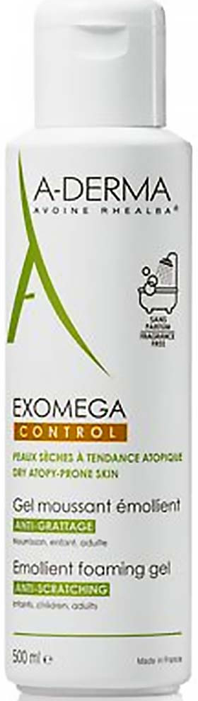 A-DERMA Exomega CONTROL Zvláčňující pěnivý gel 500 ml. Proti škrábání. Pro kojence, děti, dospělé. Bez mýdla. Bioodbouratelné složení.