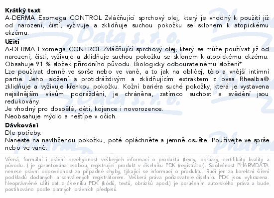 A-DERMA Exomega CONTROL Zvláčňující sprchový olej, který je vhodný k použití již od narození, čistí, vyživuje a zklidňuje suchou pokožku se sklonem k atopickému ekzému.