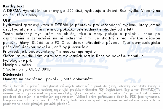 A-DERMA Hydratační sprchový gel 500 čistí, hydratuje a chrání. Bez mýdla. Vhodný na obličej, tělo a vlasy.