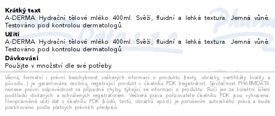 A-DERMA Hydrační tělové mléko 400ml. Svěží, fluidní a lehká textura. Jemná vůně. Testováno pod kontrolou dermatologů.
