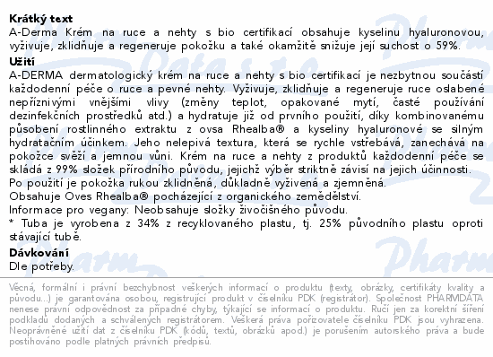 A-Derma Krém na ruce a nehty s bio certifikací obsahuje kyselinu hyaluronovou, vyživuje, zklidňuje a regeneruje pokožku a také okamžitě snižuje její suchost o 59%.
