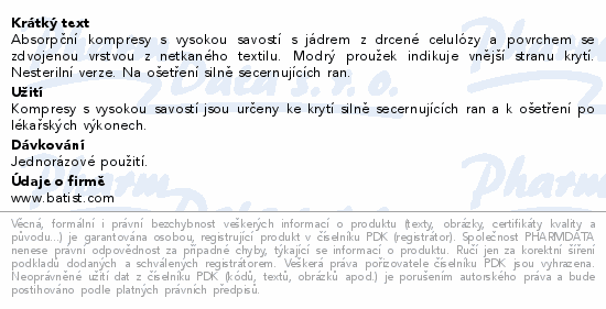 Absorpční kompresy s vysokou savostí s jádrem z drcené celulózy a povrchem se zdvojenou vrstvou z netkaného textilu. Modrý proužek indikuje vnější stranu krytí. Nesterilní verze. Na ošetření silně secernujících ran.