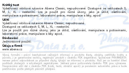 Vyšetřovací nitrilové rukavice Abena Classic, nepudrované. Dostupné ve velikostech S, M, L, XL - nesterilní. Lze je použít pro různé úkony, jako je úklid, ošetřování, manipulace s potravinami, laboratorní práce, manipulace s léky, apod.