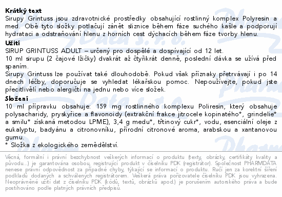 Sirupy Grintuss jsou zdravotnické prostředky obsahující rostlinný komplex Polyresin a med. Obě tyto složky potlačují zánět sliznice během fáze suchého kašle a podporují hydrataci a odstraňování hlenu z horních cest dýchacích během fáze tvorby hlenu.