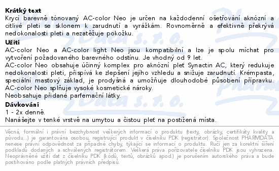 Krycí barevně tónovaný AC-color Neo je určen na každodenní ošetřování aknózní a citlivé pleti se sklonem k zarudnutí a vyrážkám. Rovnoměrně a efektivně překrývá nedokonalosti pleti a nezatěžuje pokožku.