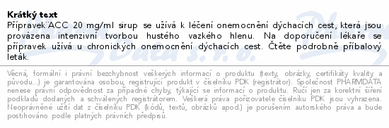 Přípravek¨ACC 20 mg/ml sirup se užívá k léčení onemocnění dýchacích cest, která jsou provázena intenzivní tvorbou hustého vazkého hlenu. Na doporučení lékaře se přípravek užívá u chronických onemocnění dýchacích cest. Čtěte pozorně příbalový leták.