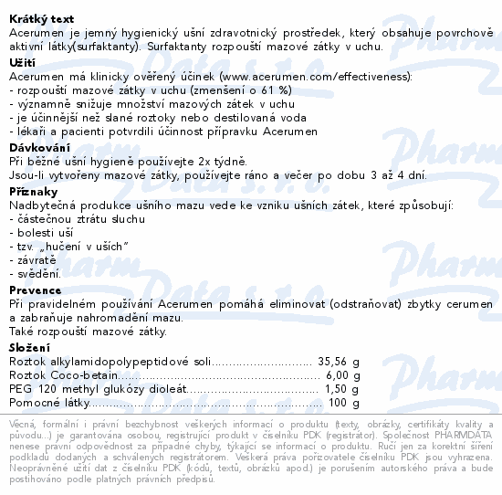 Acerumen je jemný hygienický ušní zdravotnický prostředek, který obsahuje povrchově aktivní látky(surfaktanty). Surfaktanty rozpouští mazové zátky v uchu.