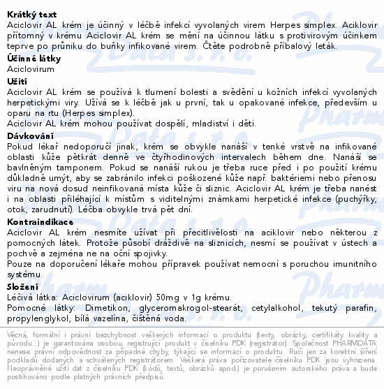 Aciclovir AL krém je účinný v léčbě infekcí vyvolaných virem Herpes simplex. Aciklovir přítomný v krému Aciclovir AL krém se mění na účinnou látku s protivirovým účinkem teprve po průniku do buňky infikované virem. Čtěte pozorně příbalový leták.