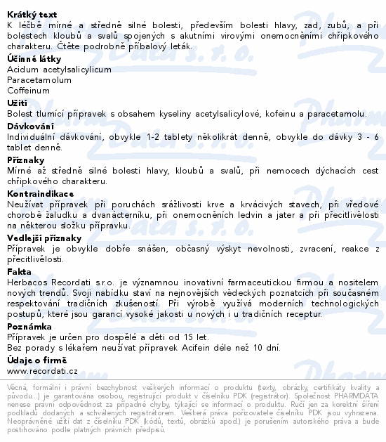Léčivými látkami jsou: acidum acetylsalicylicum, paracetamolum, coffeinum. Jedna tableta obsahuje acidum acetylsalicylicum 250 mg, paracetamolum 200 mg, coffeinum 50 mg. Pomocnými látkami jsou: glycin, kukuřičný škrob, mastek, hyprolosa.