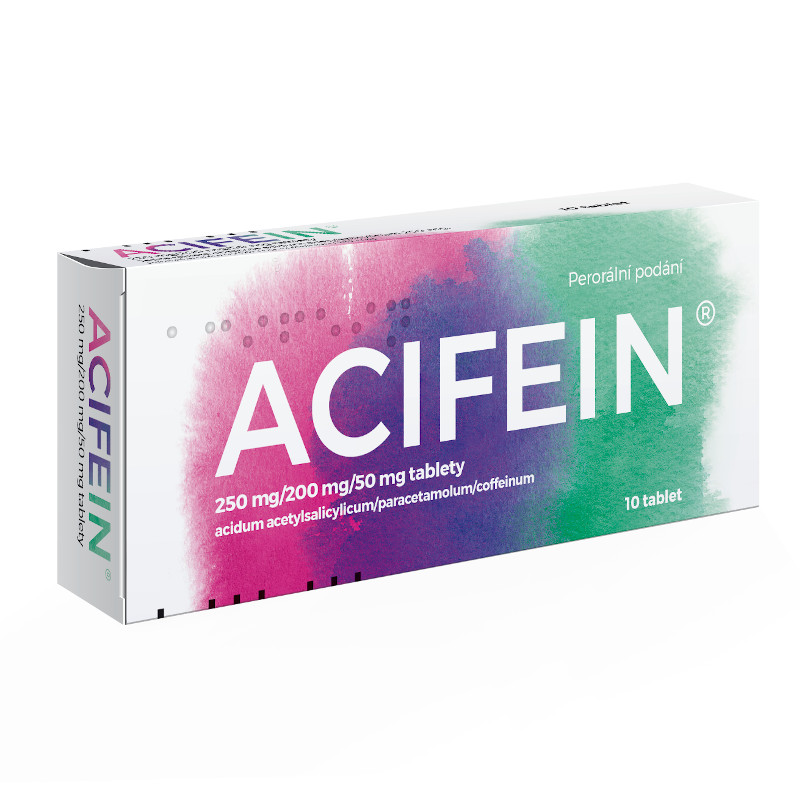 ACIFEIN patří do skupiny léků tlumících bolest, které nazýváme analgetika. Bolest tlumící účinek kyseliny acetylsalicylové je zvýrazňován kofeinem a dalšími látkami. Přípravek se používá k léčbě mírné a středně silné bolesti, především bolesti hlavy, zad, zubů, při neuralgii (bolest pociťovaná v průběhu nervu) a při bolestech kloubů a svalů spojených s akutními virovými onemocněními chřipkového charakteru.