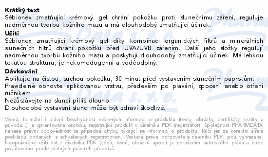 Sébionex zmatňující krémový gel chrání pokožku proti slunečnímu záření, reguluje nadměrnou tvorbu kožního mazu a má dlouhodobý zmatňující účinek.