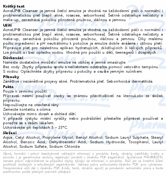 AcneUP® Cleanser je jemná čistící emulze je vhodná na každodenní péči o normální i problematickou pleť (např. akné, rosacea, seborrhoea). Šetrně odstraňuje nečistoty a make-up, zanechává pokožku přirozeně pružnou, vláčnou a jemnou.
