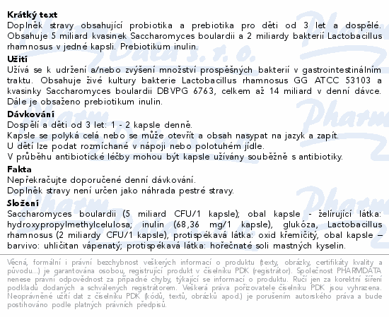 Doplněk stravy obsahující probiotika a prebiotika pro děti od 3 let a dospělé. Obsahuje 5 miliard kvasinek Saccharomyces boulardii a 2 miliardy bakterií Lactobacillus rhamnosus v jedné kapsli. Prebiotikum inulin.