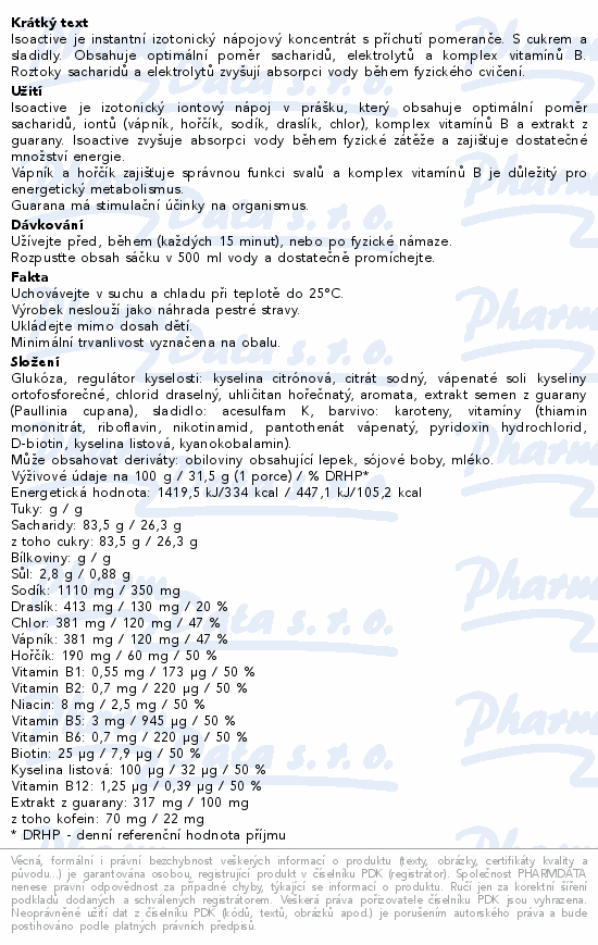 Isoactive je instantní izotonický nápojový koncentrát s příchutí pomeranče. S cukrem a sladidly. Obsahuje optimální poměr sacharidů, elektrolytů a komplex vitamínů B. Roztoky sacharidů a elektrolytů zvyšují absorpci vody během fyzického cvičení.