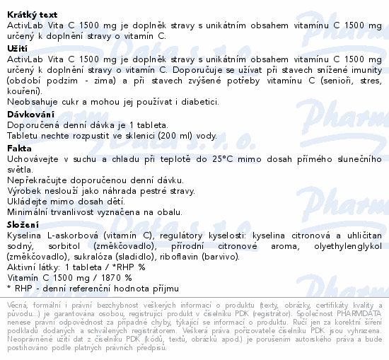 ActivLab Vita C 1500 mg je doplněk stravy s unikátním obsahem vitamínu C 1500 mg určený k doplnění stravy o vitamín C.