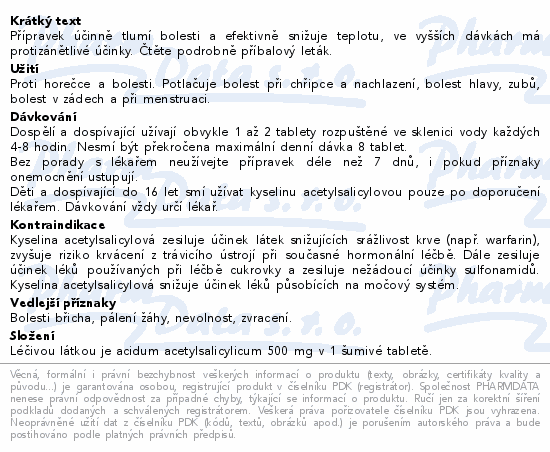 Léčivou látkou je acidum acetylsalicylicum 500 mg v 1 šumivé tabletě.