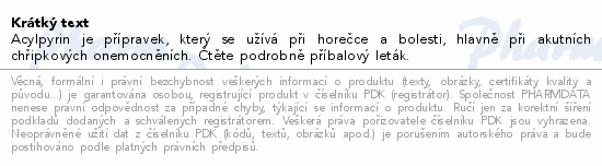 | Farmako-terapeutická skupina, účinné látky: | NERVOVÝ SYSTÉM -> ANALGETIKA -> JINÁ ANALGETIKA A ANTIPYRETIKA -> KYSELINA ACETYLSALICYLOVÁ A DERIVÁTY -> KYSELINA ACETYLSALICYLOVÁ |