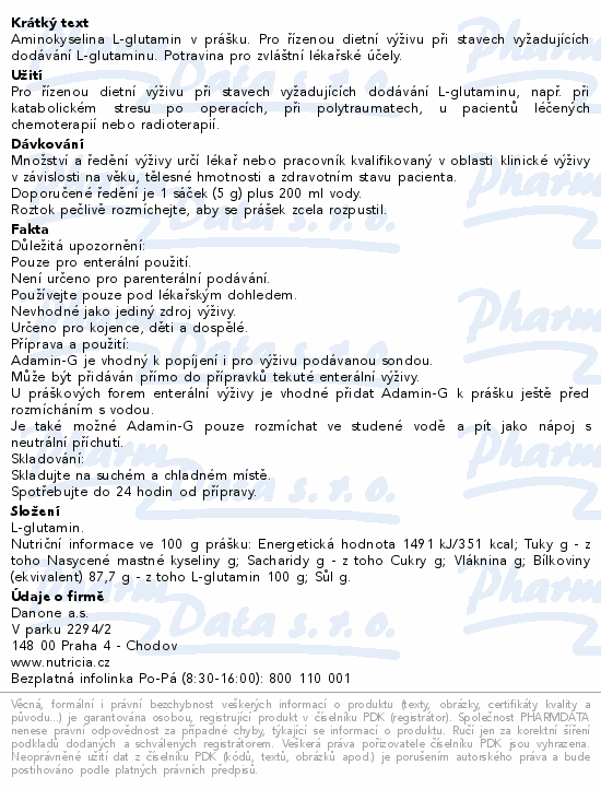 Aminokyselina L-glutamin v prášku. Pro řízenou dietní výživu při stavech vyžadujících dodávání L-glutaminu. Potravina pro zvláštní lékařské účely.