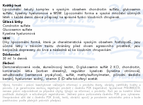Lipozomální tekutý komplex s vysokým obsahem chondroitin sulfátu, glukosamin sulfátu, kyseliny hyaluronové a MSM. Lipozomální forma a vysoké množství účinných látek v každé denní dávce přispívají ke správné funkci kloubních chrupavek.