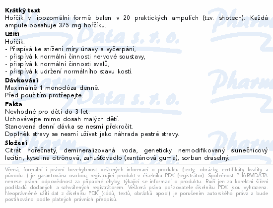 Hořčík v lipozomální formě balen v 20 praktických ampulích (tzv. shotech). Každá ampule obsahuje 375 mg hořčíku.