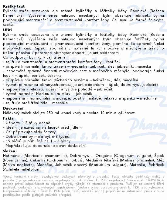 Bylinná směs sestavená dle známé bylinářky a léčitelky báby Radnické (Božena Kamenická). Vyvážená směs nahrubo nasekaných bylin obsahuje řebříček, bylinu podporující menstruační a premenstruační komfort ženy. Čaj nyní ve formě čajových sáčků.