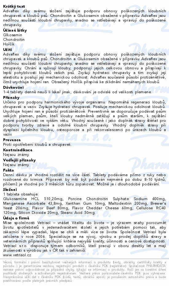 Advaflex díky svému složení zajišťuje podporu obnovy poškozených kloubních chrupavek a kloubů psů. Chondroitin a Glukosamin obsažené v přípravku Advaflex jsou nedílnou součástí kloubní chrupavky, snadno se vstřebávají a vpravují do poškozené chrupavky.