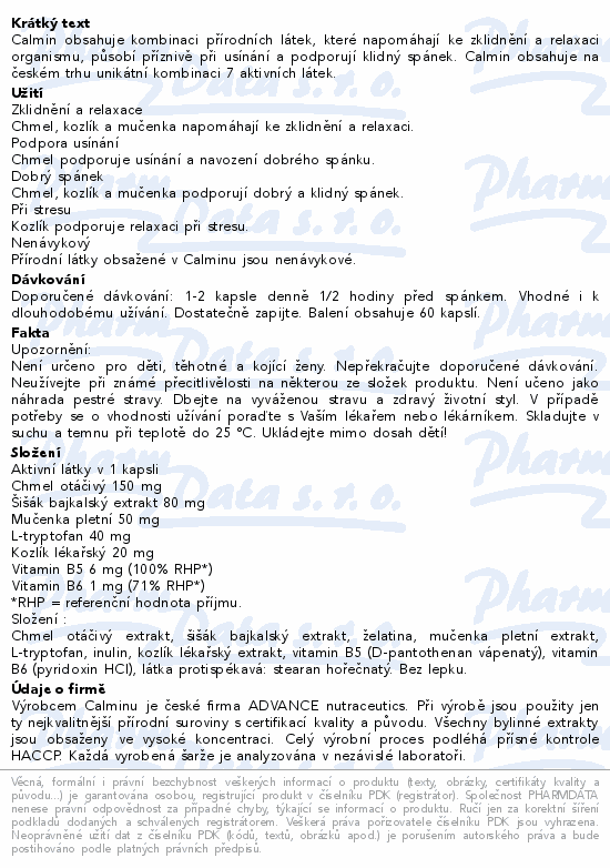 Calmin obsahuje kombinaci přírodních látek, které napomáhají ke zklidnění a relaxaci organismu, působí příznivě při usínání a podporují klidný spánek. Calmin obsahuje na českém trhu unikátní kombinaci 7 aktivních látek.