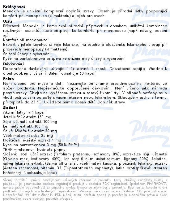 Menoxin je unikátní komplexní doplněk stravy. Obsahuje přírodní látky podporující komfort při menopauze (klimakteriu) a jejích projevech.