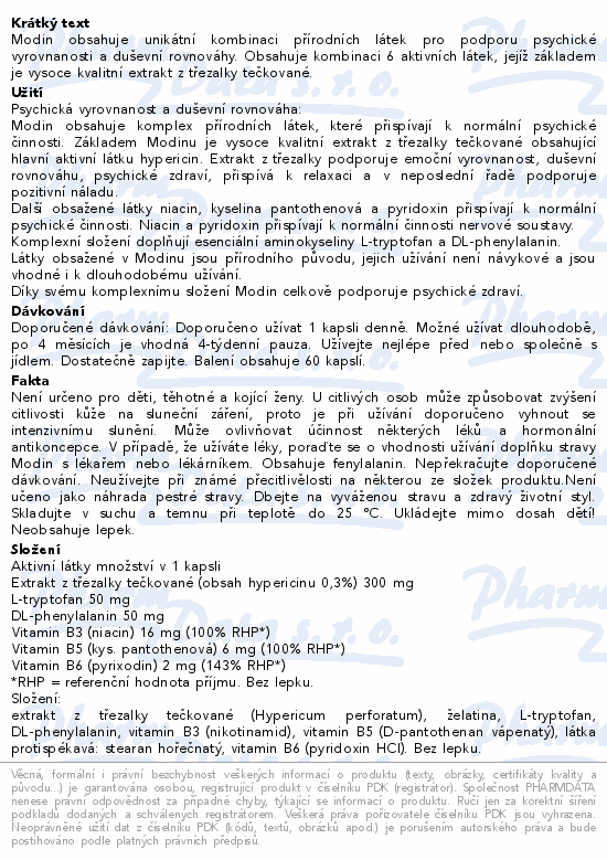 Modin obsahuje unikátní kombinaci přírodních látek pro podporu psychické vyrovnanosti a duševní rovnováhy. Obsahuje kombinaci 6 aktivních látek, jejíž základem je vysoce kvalitní extrakt z třezalky tečkované.