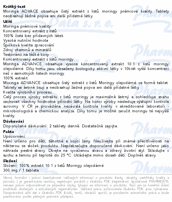 Moringa ADVACE obsahuje čistý extrakt z listů moringy prémiové kvality. Tablety neobsahují žádná pojiva ani další přídatné látky.