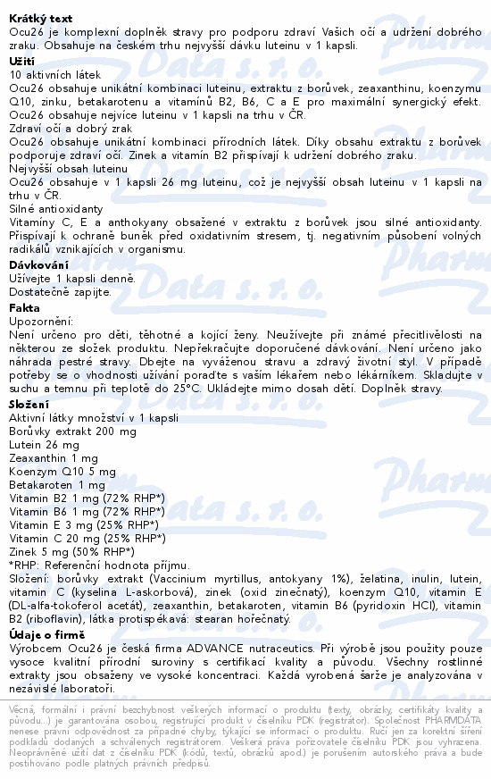 Ocu26 je komplexní doplněk stravy pro podporu zdraví Vašich očí a udržení dobrého zraku. Obsahuje na českém trhu nejvyšší dávku luteinu v 1 kapsli.