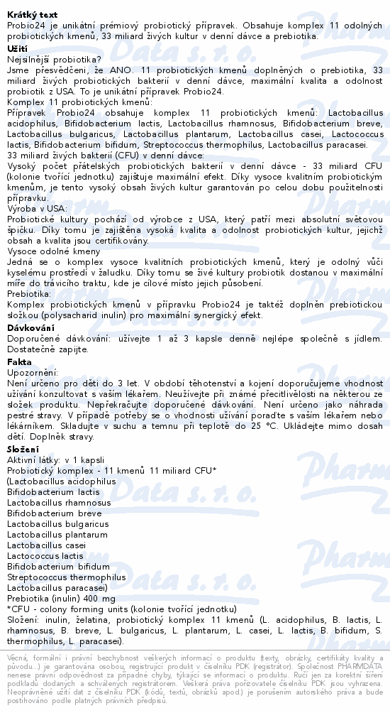 Probio24 je unikátní prémiový probiotický přípravek. Obsahuje komplex 11 odolných probiotických kmenů, 33 miliard živých kultur v denní dávce a prebiotika.
