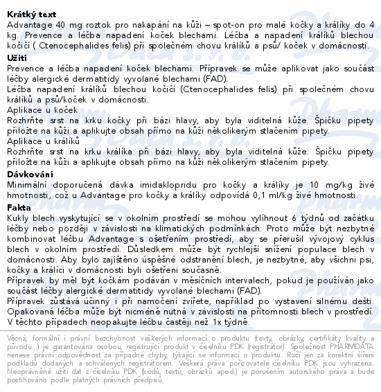 Advantage 40 mg roztok pro nakapání na kůži – spot-on pro malé kočky a králíky do 4 kg. Prevence a léčba napadení koček blechami. Léčba a napadení králíků blechou kočičí ( Ctenocephalides felis) při společném chovu králíků a psů/ koček v domácnosti.