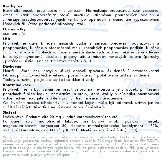 Léčivou látkou je escinum alfa (escin alfa). Jedna enterosolventní tableta obsahuje escinum alfa 20 mg. Pomocnými látkami jsou: Jádro tablety: monohydrát laktózy, bramborový škrob, povidon 25, mastek, magnesium-stearát. Potahová vrstva tablety: polysorbát 80, disperze methakrylátového kopolymeru L 30%, mastek, sodná sůl karmelózy, oxid titaničitý (E 171), hlinitý lak oranžové žluti (E 110), povidon 25, simetikonová emulze 30%.