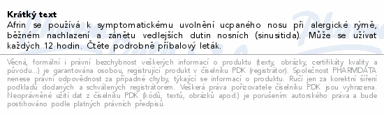 Afrin se používá k symptomatickému uvolnění ucpaného nosu při alergické rýmě, běžném nachlazení a zánětu vedlejších dutin nosních (sinusitida). Může se užívat každých 12 hodin. Čtěte pozorně příbalový leták.