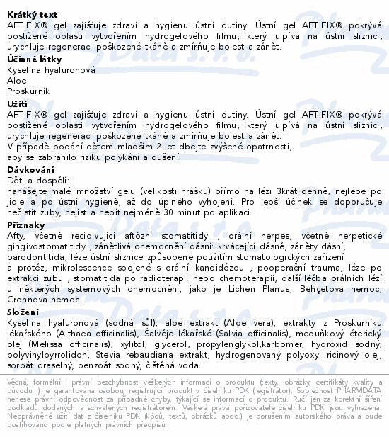 AFTIFIX® gel zajišťuje zdraví a hygienu ústní dutiny. Ústní gel AFTIFIX® pokrývá postižené oblasti vytvořením hydrogelového filmu, který ulpívá na ústní sliznici, urychluje regeneraci poškozené tkáně a zmírňuje bolest a zánět.