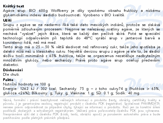 Agáve sirup BIO 600g Wolfberry je díky vysokému obsahu fruktózy a nízkému glykemickému indexu sladidlo budoucnosti. Vyrobeno v BIO kvalitě.