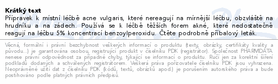 Přípravek k místní léčbě acne vulgaris, které nereagují na mírnější léčbu, obzvláště na hrudníku a na zádech. Používá se k léčbě těžších forem akné, které nedostatečně reagují na léčbu 5% koncentrací benzoylperoxidu. Čtěte pozorně příbalový leták.