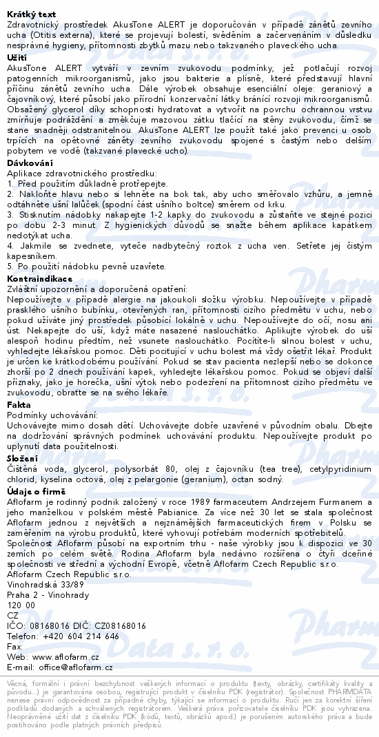 Zdravotnický prostředek AkusTone ALERT je doporučován v případě zánětů zevního ucha (Otitis externa), které se projevují bolestí, svěděním a začervenáním v důsledku nesprávné hygieny, přítomnosti zbytků mazu nebo takzvaného plaveckého ucha.