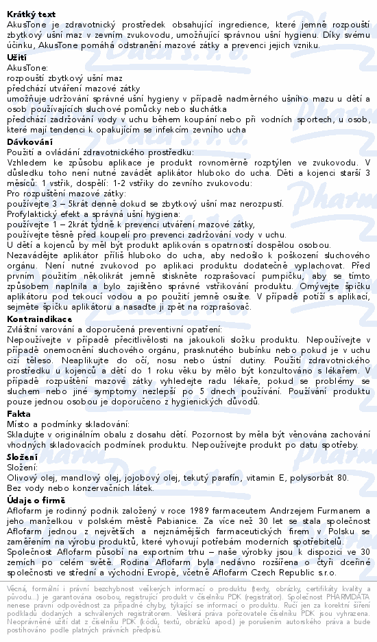 AkusTone je zdravotnický prostředek obsahující ingredience, které jemně rozpouští zbytkový ušní maz v zevním zvukovodu, umožňující správnou ušní hygienu. Díky svému účinku, AkusTone pomáhá odstranění mazové zátky a prevenci jejich vzniku.